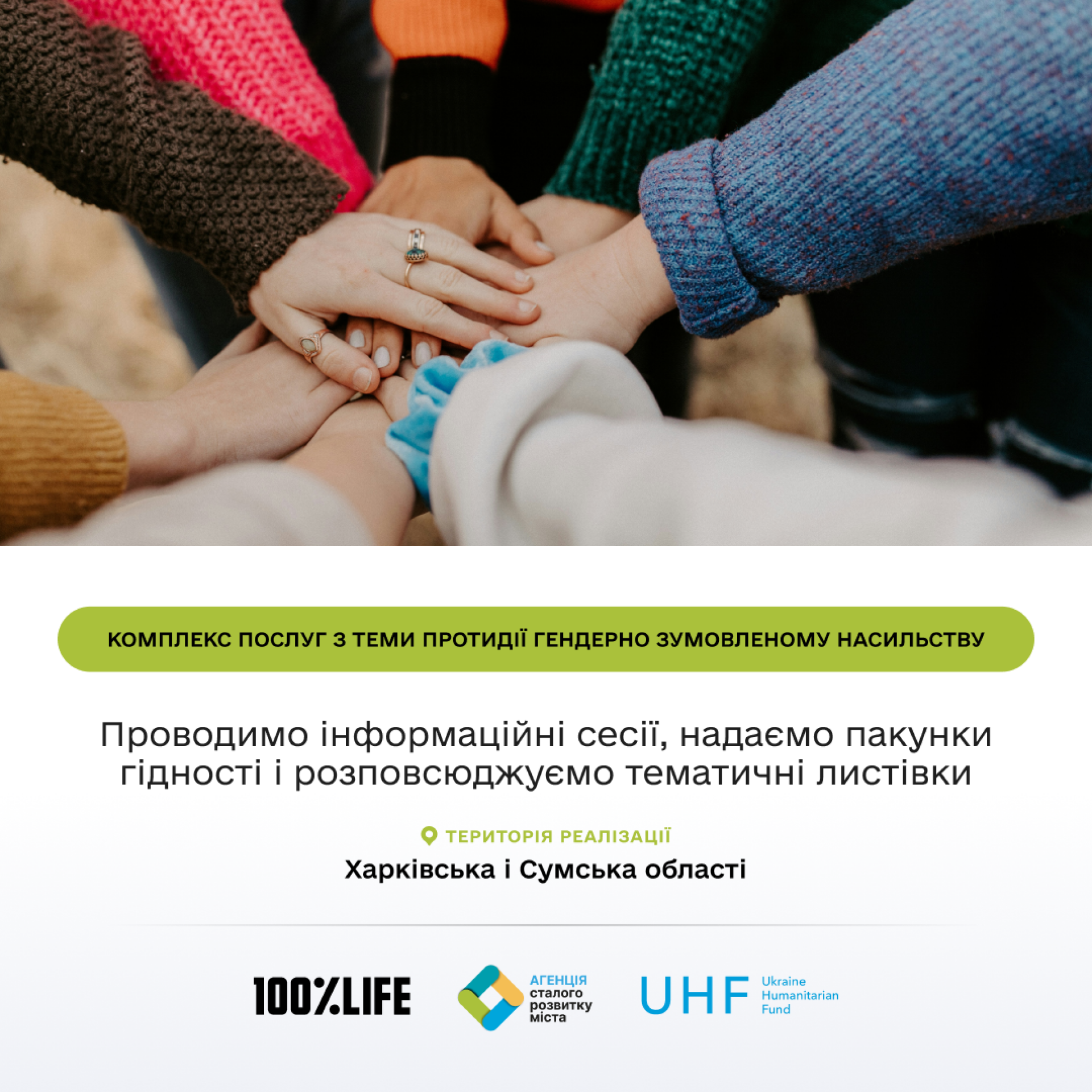 Комплекс послуг з теми протидії гендерно зумовленому насильству надається у рамках проєкту «Від вразливості до сили: Комплексна ініціатива захисту», який реалізує БО «100% Життя» у партнерстві з ГО «Агенція сталого розвитку міста» за фінансової підтримки Гуманітарного фонду для України (UHF).